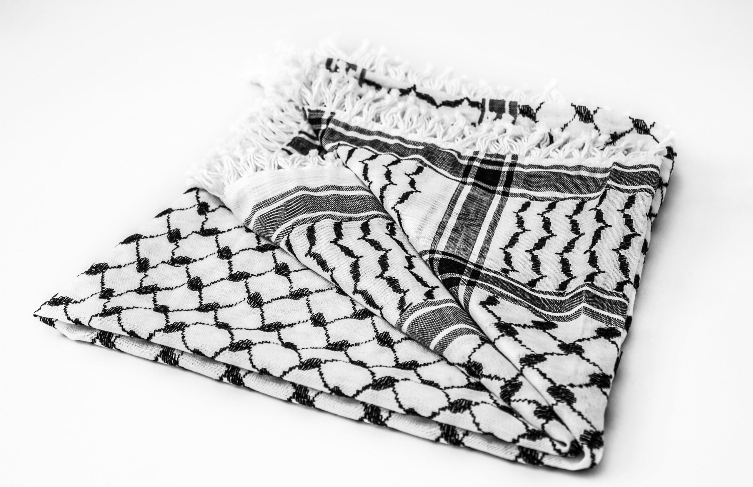 Direct from the source. Largest standard size, 47” by 47”, over 15 sq. ft. Made on a custom kufiya loom and finished by hand by traditional artisinal weavers at the last factory in Palestine and the rest of the region. Legendary piece from the factory that started counting its 7th decade of operation. A Diamond Dust Mfg exclusive.