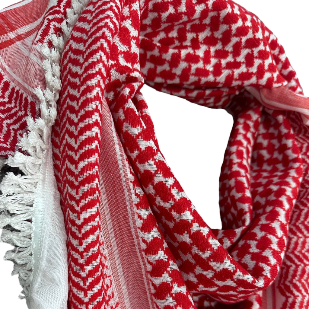 Direct from the source. Largest standard size, 47” by 47”, over 15 sq. ft. Made on a custom kufiya loom and finished by hand by traditional artisinal weavers at the last factory in Palestine and the rest of the region. Legendary piece from the factory that started counting its 7th decade of operation. A Diamond Dust Mfg exclusive.