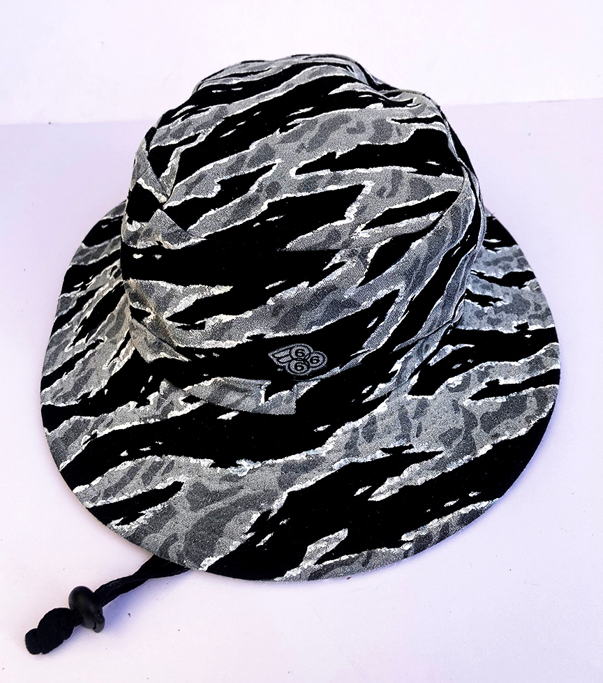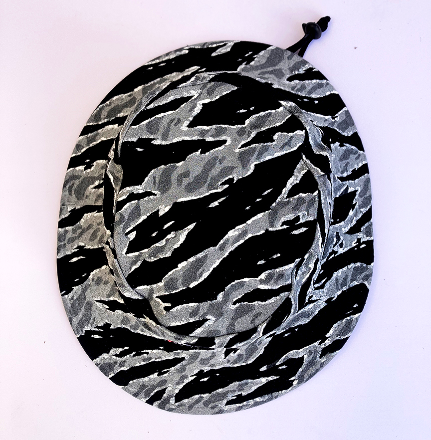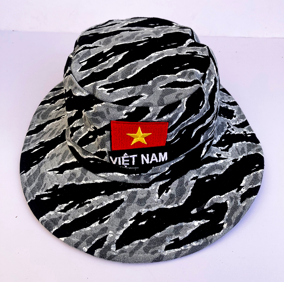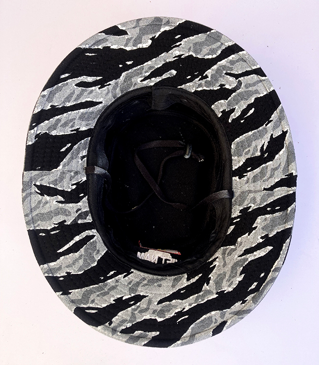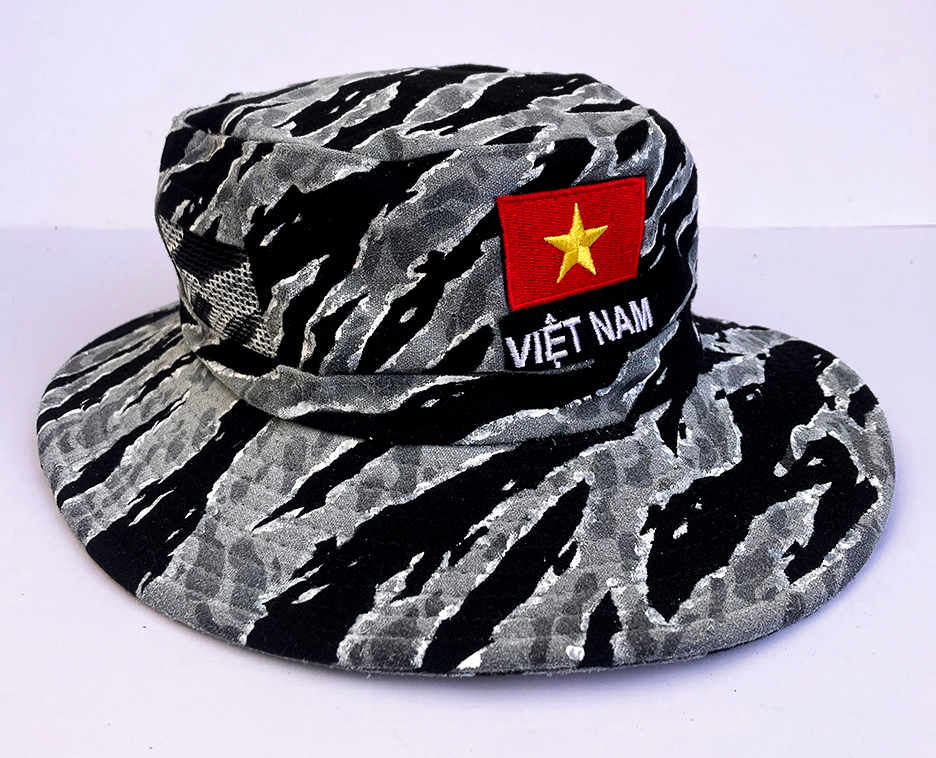 Hand painted Special Forces style Urban Tiger Stripe camo on a wide brim vented boonie hat (Black) from a trip to Vietnam. One of a kind. Measures around a 7 1/2″