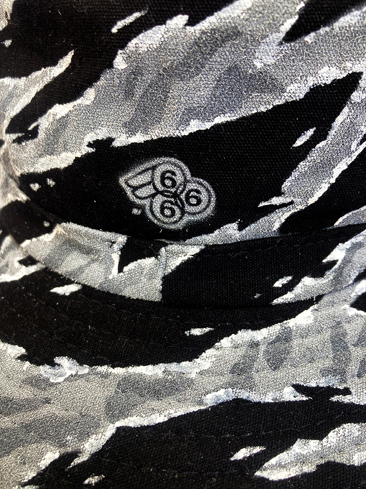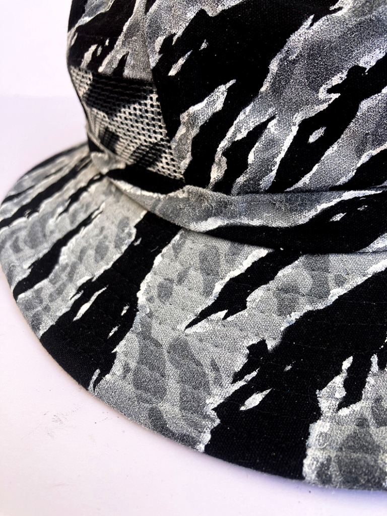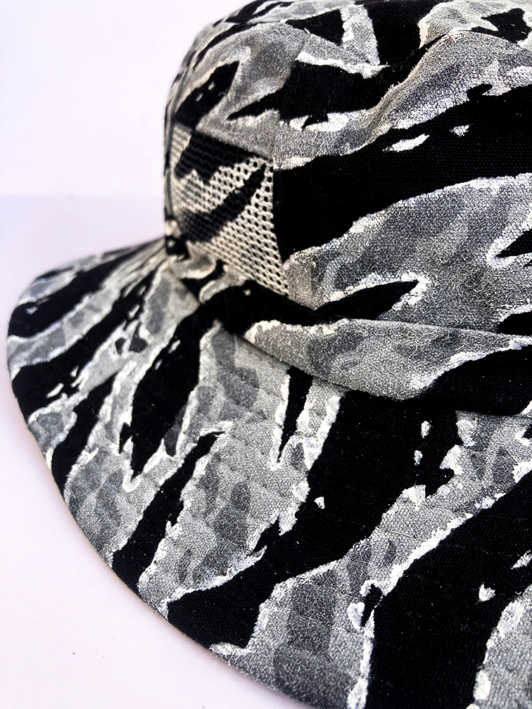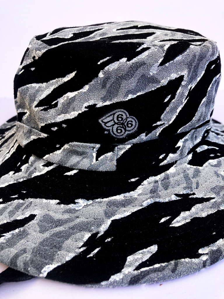 Hand painted Special Forces style Urban Tiger Stripe camo on a wide brim vented boonie hat (Black) from a trip to Vietnam. One of a kind. Measures around a 7 1/2″