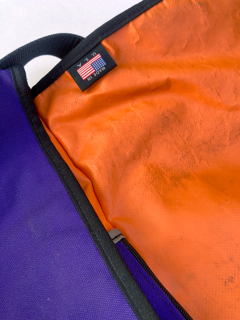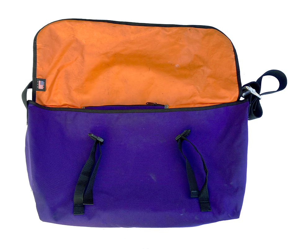 Made in the USA by Peters Mountain Works for John Peters. These bags were one of very few messenger bags you could get back in the day, a few courier companies made these available to their riders. Large size bag with internal zip divider. Clean construction and fully tarp lined, it shows signs of very light use. Excellent condition for its age, this is a true messenger collectible.